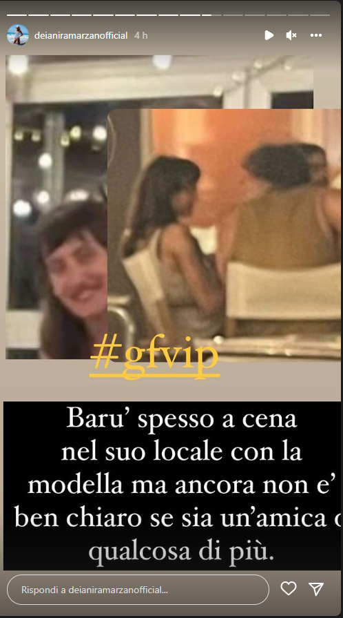 A sollevare dubbi sul tipo di rapporto tra i due è Deianira Marzano, che in una storia Instagram mostra la foto dell’ex vippone e della modella che si trovano nel temporary restaurant sui navigli e scrive: “Barù spesso a cena nel suo locale con la modella ma ancora non è ben chiaro se sia un’amica o qualcosa di più”.