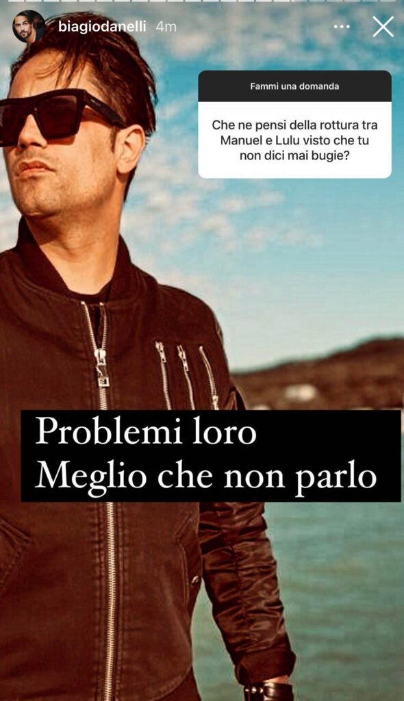 Infine da pochi giorni i due ex gieffini Manuel Bortuzzo e Lulù Selassié hanno chiuso ufficialmente la loro storia d’amore. Un fan ha chiesto a Biagio: “Che ne pensi della rottura tra Manuel e Lulù visto che tu non dici mai bugie?”, l’ex gieffino riguardo l’argomento ha scelto di non esporsi e dunque ha risposto con freddezza: “Problemi loro. Meglio che non parlo”.