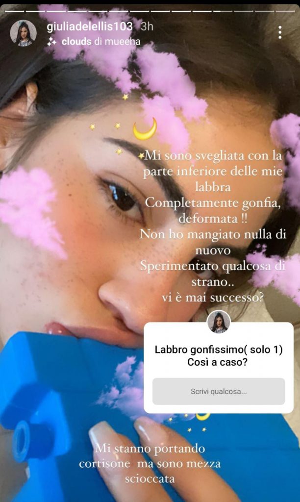 Ha fatto delle Instagram stories chiedendo consiglio ai suoi followers riguardo al fatto che si sia ritrovata col labbro inferiore molto gonfio. Nelle stories ha scritto “Completamente gonfia e deformata!” nel mentre che aveva poggiato del ghiaccio sulla bocca.