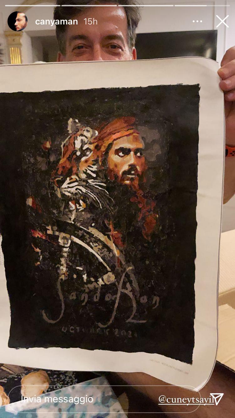 Nella foto vi è Cüneyt Sayıl, manager dell’attore, che tiene in mano una tela. In uno sfondo nero, sulla tela vi è il volto di Can Yaman con accanto il disegno di una tigre. Sotto in basso vi è scritto “Sandokan” e poco più giù un riferimento temporale: “October 2021”.