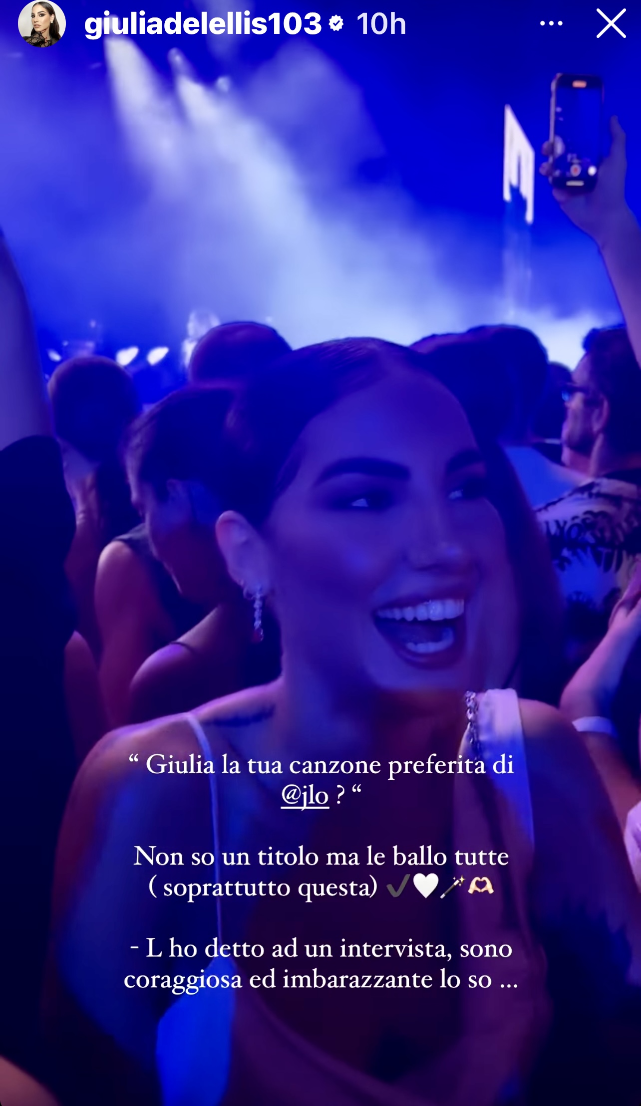 Giulia De Lellis, anche lei presente al grande show – nonostante abbia ammesso di non conoscere “neanche un titolo” delle canzoni di Jennifer Lopez, ha dichiarato attraverso un’ironica Instagram Story di “non poter fare a meno di ballare la sua musica, soprattutto il brano On The Floor”, tra i più apprezzati e gettonati dell’intera performance.