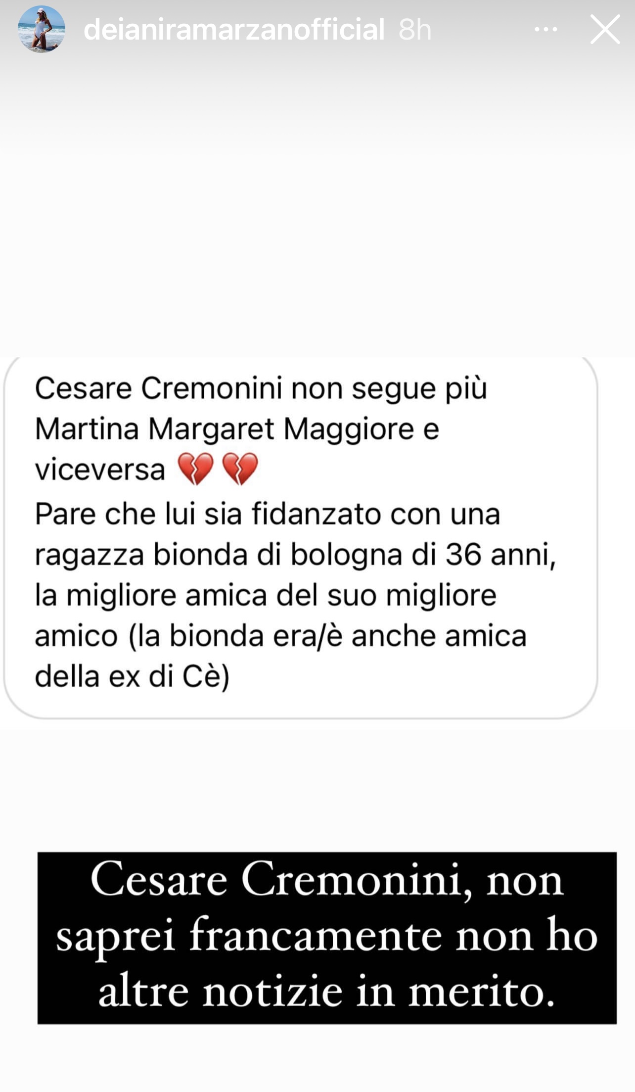 Una storia, quella tra Cremonini e la Maggiore, raccontata dallo stesso artista attraverso un brano e un video realizzati durante il primo lockdown del 2020. Sembrava impossibile che tra i due potesse finire l’amore, invece è accaduto l’impensabile. I fan, ancora increduli, sono alla ricerca dell’identità della nuova compagna di Cremonini.