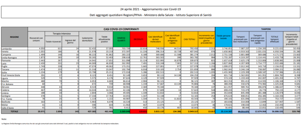 I dati del contagio da Coronavirus di oggi, sabato 24 aprile 2021, registrano 13.817 casi e 322 vittime. Più basso rispetto a ieri il numero dei nuovi positivi giornalieri. Sempre alto il numero dei decessi. Tasso di positività al 4,3%.