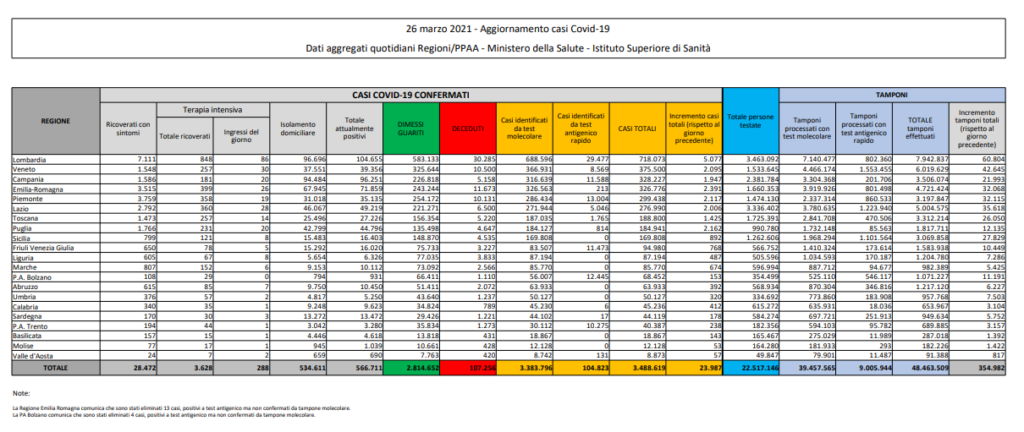 I dati del contagio da Coronavirus di oggi, venerdì 26 marzo 2021, registrano 23.987 casi e 457 vittime. In aumento il numero dei nuovi positivi giornalieri, sempre alto il numero dei decessi. Tasso di positività stabile al 6,8%.