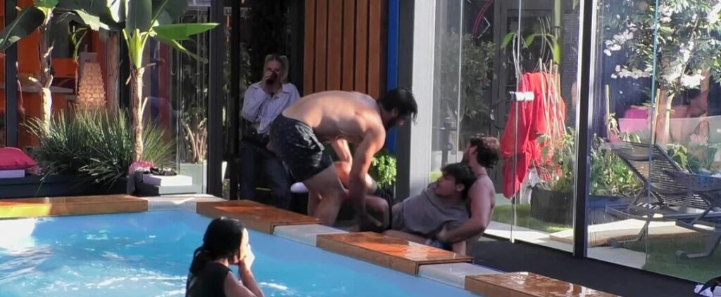 Come in ogni edizione al Grande Fratello in un momento di relax e di goliardia non posso mancare i tuffi in piscina a sorpresa. Mattia e Omer in primis gettano Francesca in acqua e subito dopo poco tentano di prendere anche Simone e di buttarlo in piscina ma in un primo momento riesce a fuggire, poi anche lui finisce in acqua.