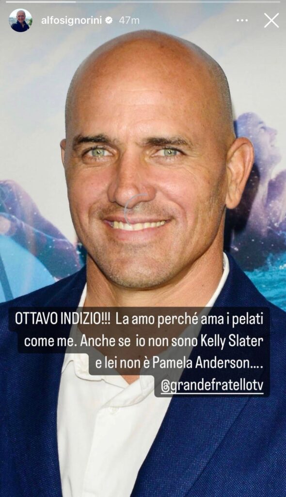 “Ottavo Indizio!!! La amo perchè ama i pelati come me. Anche se io non sono Kelly Slater e lei non è Pamela Anderson…”.