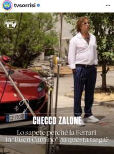 Nel nuovo film di Checco Zalone Buen Camino una Ferrari rosso fiammante cattura l’attenzione non solo per la scena ma anche per la targa. Sul bolide si legge la sigla CZ71OQT, un dettaglio che ha subito acceso la curiosità dei fan e degli spettatori più attenti. Quel codice non è un semplice numero di fantasia ma un messaggio simbolico voluto dal comico pugliese e dal suo team creativo.
