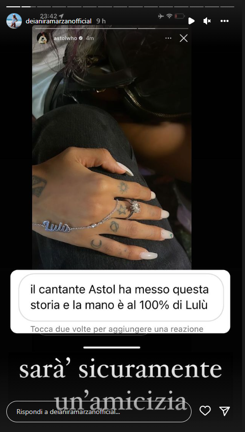 Ed è proprio un’utente a segnalare adesso il possibile flirt tra Lulù Selassié e il cantante Astol: “Il cantante Astol ha messo questa storia e la mano è al 100% di Lulù” scrive nel messaggio diretto a Deianira che però commenta così: “sarà sicuramente un’amicizia”.
