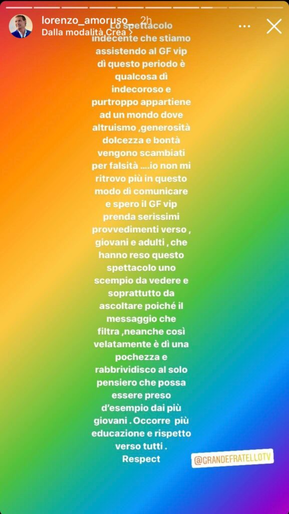 “Lo spettacolo indecente che stiamo assistendo al GF Vip di questo periodo è qualcosa di indecoroso e purtroppo appartiene ad un mondo dove altruismo, generosità, dolcezza e bontà vengono scambiati per falsità… io non mi ritrovo più in questo modo di comunicare e spero il GF Vip prenda serissimi provvedimenti verso giovani e adulti, che hanno reso questo spettacolo uno scempio da vedere e soprattutto da ascoltare poichè il messaggio che filtra, neanche così velatamente è di una pochezza e rabbrividisco al solo pensiero che possa essere preso d’esempio dai più giovani. Occorre più educazione e rispetto verso tutti. Respect”