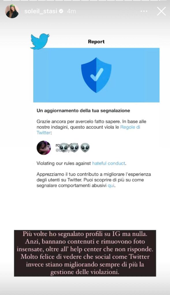 “Molto felice di vedere che social come Twitter invece stiano migliorando sempre di più la gestione delle violazioni”.